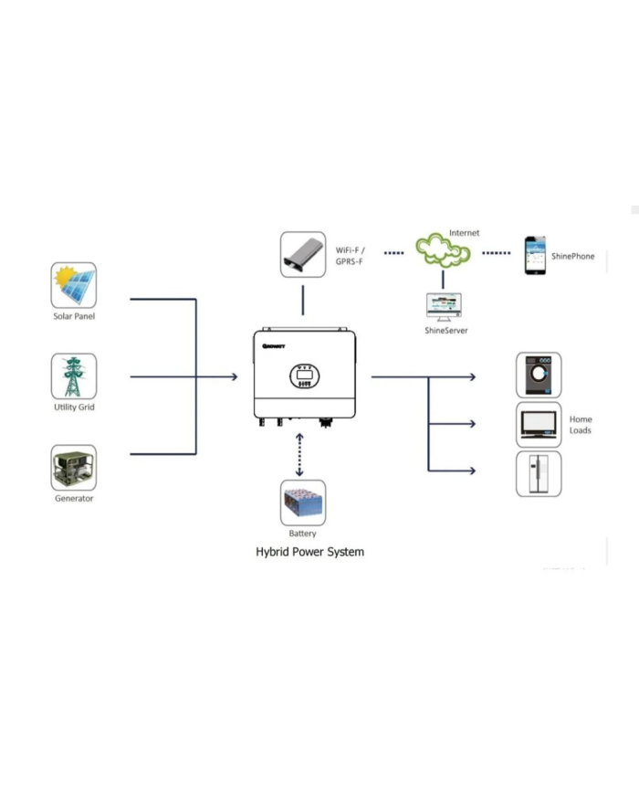 Invertor + încărcător solar MPPT + încărcător din rețea/generator într-un singur echipament.
