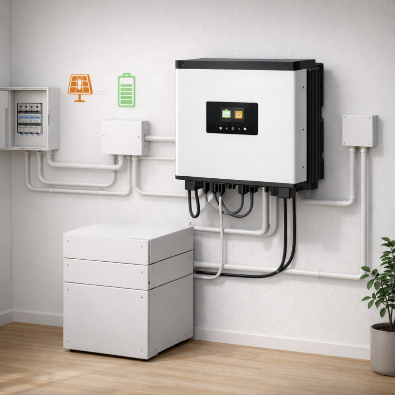 Schema de conectare (on-grid/off-grid/backup), dimensionarea stringurilor PV (Voc la rece), compatibilitatea bateriei 48 V și protecțiile DC/AC (siguranțe, întrerupătoare, SPD), plus conformitatea cu normativele locale.